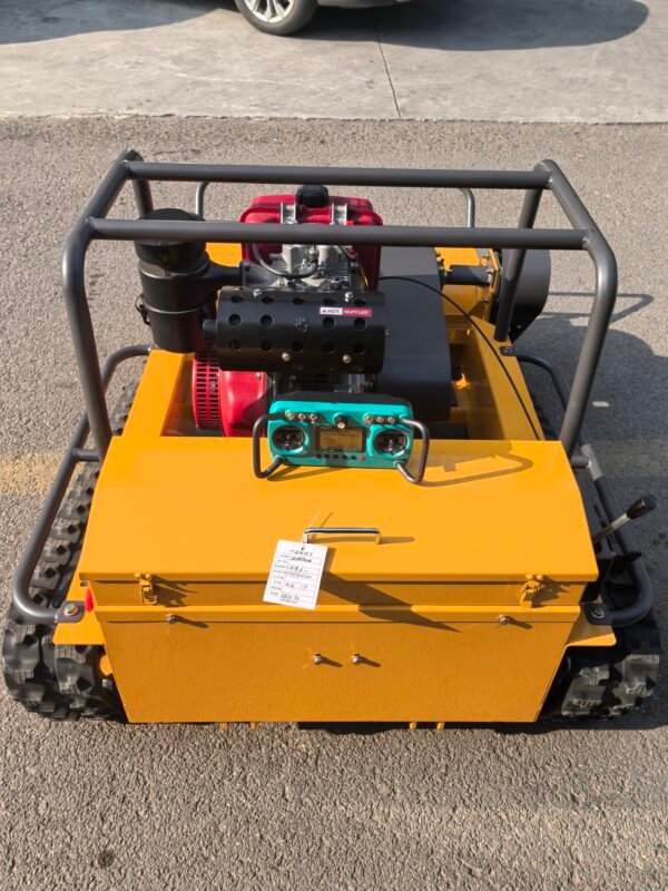 All our mowers feature emergency stop buttons on both the machine and remote controller, automatic engine shutdown when losing remote signal, blade brake systems, LED warning lights, and rollover protection design. Safety guards around all moving parts are standard on every model.