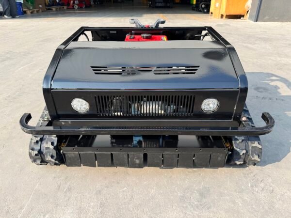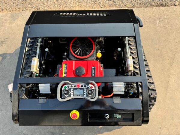 All our mowers feature emergency stop buttons on both the machine and remote controller, automatic engine shutdown when losing remote signal, blade brake systems, LED warning lights, and rollover protection design. Safety guards around all moving parts are standard on every model.